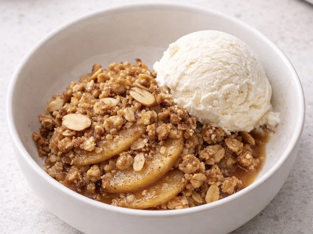 A warm and comforting apple crisp with a lightly spiced filling and a golden, crumbly topping. A touch of almond adds subtle depth, making this classic dessert feel just a bit special.