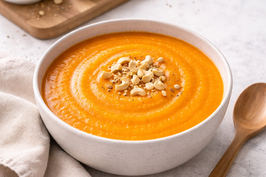 A smooth and naturally creamy soup made with sweet carrots, fresh ginger, and blended cashews. Brightened with lemon, this soup is balanced, clean, and full of flavor.