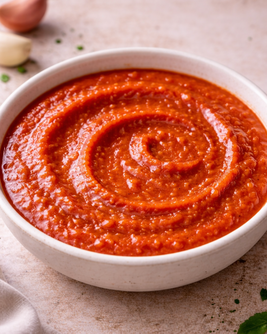 Roasted red peppers and tomatoes are simmered with garlic, onion, and herbs to create a smooth, deeply flavored sauce with natural sweetness and a balanced finish.