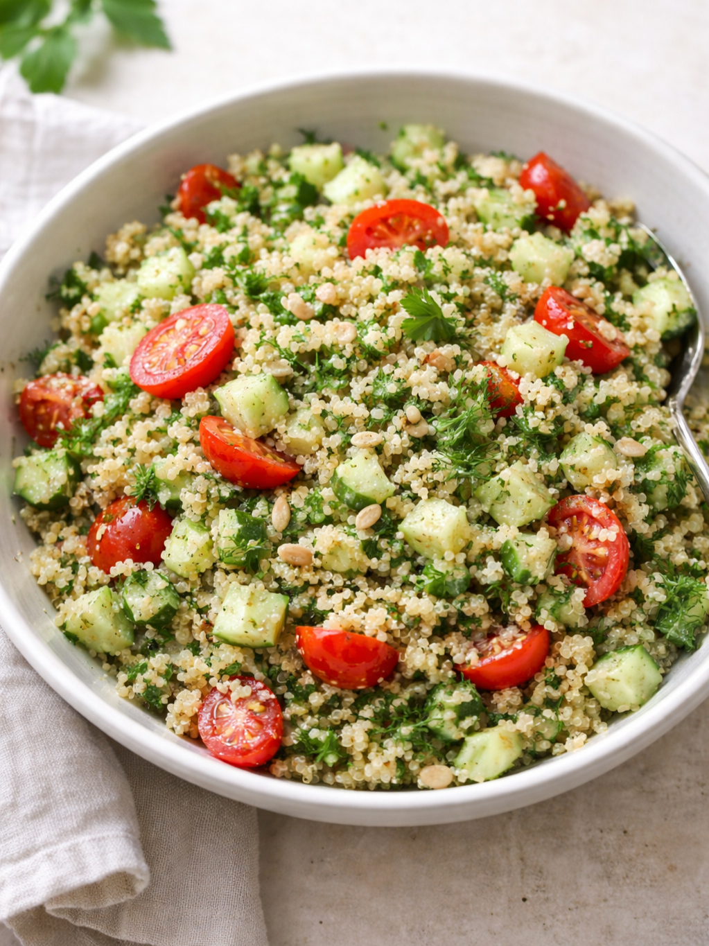 Transfer the warm quinoa to a large bowl. Stir in the softened shallots, then add cucumber, tomatoes, parsley, and dill.