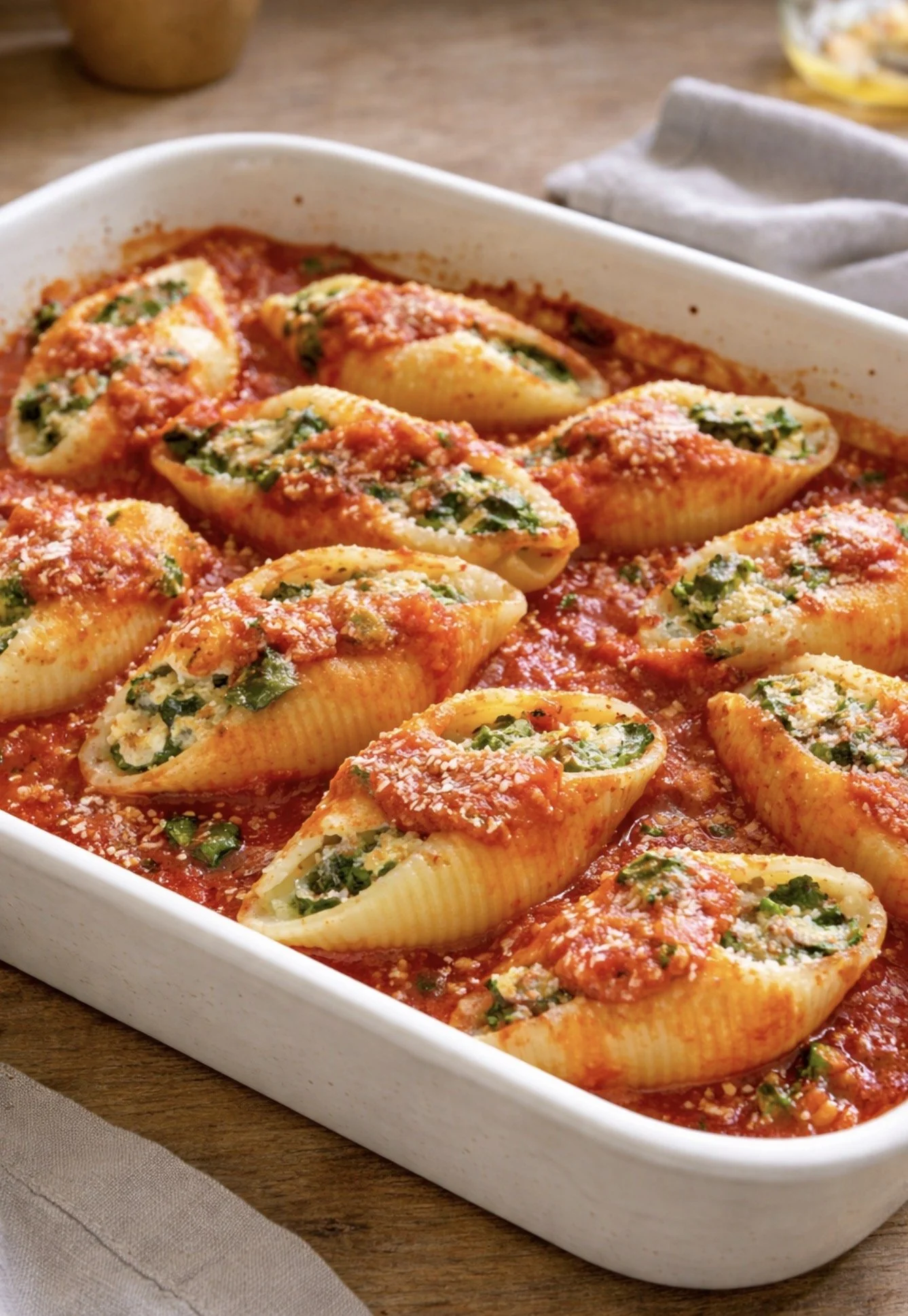 Tender pasta shells filled with a creamy spinach-and-ricotta mixture, then baked in a rich tomato sauce. A classic, comforting dish with balanced, satisfying flavor.